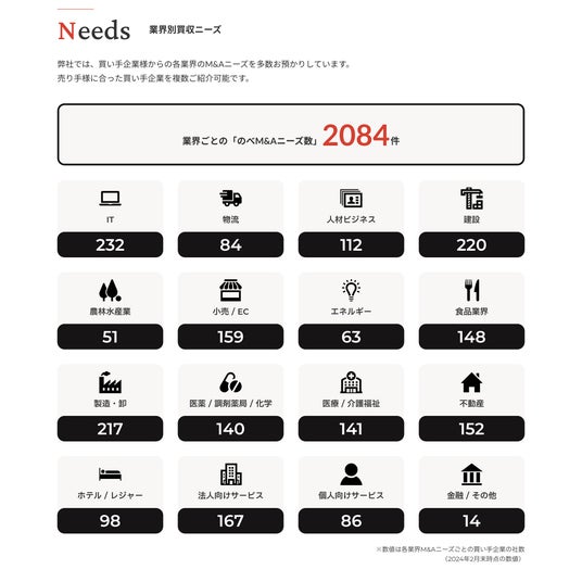 現在、弊社では、業種ごとにのべ2000件の買収ニーズを蓄積しております。(2024年2月末段階)