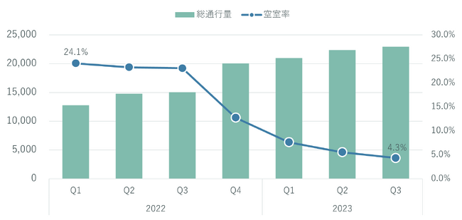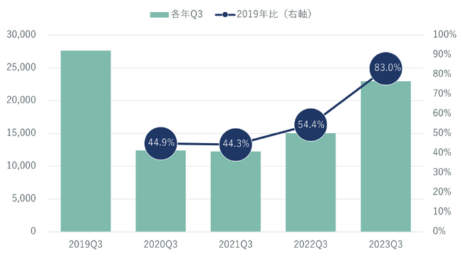 2023年Q3の総通行量は2019年比83.0%の水準まで回復