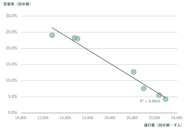 Figure5: 心斎橋筋商店街通行量と心斎橋筋ハイストリート空室率の相関(2022Q1以降)