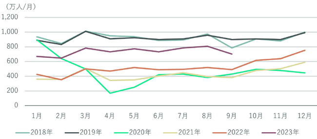・2023年1月以降の月間通行量推移を2019年比でみると、月を追うごとに通行量が回復していく傾向がみられ、7月には最大で86.5%まで回復がみられた。その後8月~9月にかけては通行量の回復ペースは鈍化したものの、2019年比で80%前後の水準を維持している(Figure2)。