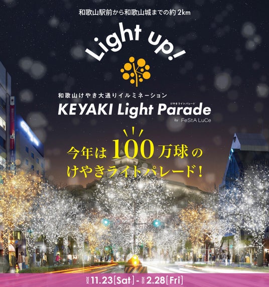 けやき大通りイルミネーション実行委員会(実行委員長:古澤良祐)は、JR和歌山駅前から西へと続くけやき大通りの約2kmをイルミネーションで彩るライトアッププロジェクト「KEYAKI LIGHT PARADE by FeStA LuCe」を2024年11月23日(土・祝)より開催いたします。