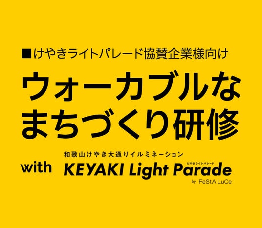 国交省が「居心地が良く歩きたくなる」まちなかづくりを掲げ、ウォーカブル推進施策を実行するとともに、全国160団体・自治体が「ウォーカブル推進都市」に賛同し政策の実行を推進しており、和歌山市もそのモデル都市の一つに選定されています。ウォーカブルなまちづくり研修では、KEYAKI LIGHT PARADEがウォーカブルなまちづくりを牽引し、周辺地域の課題解決や魅力創出にどのように寄与できるか、参加企業が持つリソースやアイデアを元に、具体策を出しあい実施されました。