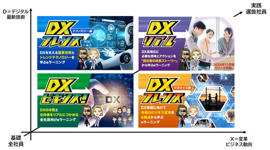 11月にはシリーズ第4弾となる、推進に必要な思考とアクションを担当者の成長ストーリーから学ぶ「DXリアル」をリリース予定です。「知識習得で終わらせない仕掛け」「事前知識ゼロでも容易に楽しく学べる工夫」といった、弊社のeラーニングの特徴を生かしながら、これからも全社一丸でのDX推進を、社員教育を通じてご支援してまいります。