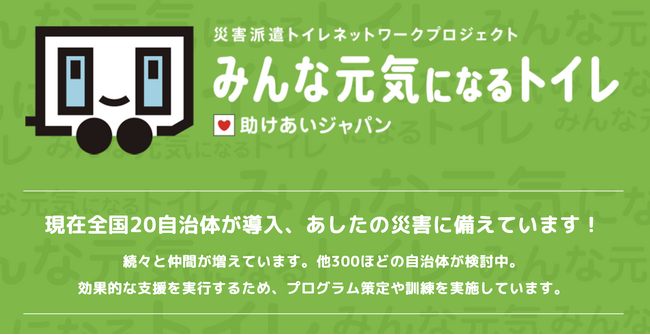 一般社団法人助けあいジャパンの災害支援トイレネットワークプロジェクト「みんな元気になるトイレ」は、安心・安全・清潔なトイレを被災自治体にお届けし、避難者・ボランティアなどトイレが使えない近隣住民・自衛隊や医療関係者などの支援のプロに使用いただき、排泄のストレスを感じることなく復興への道のりを支えるものです。一度出動すると短くて一月、長くて半年ほど無償貸与させていただいています。2018年プロジェクト発足以来、日本中多くの被災自治体へ出動支援をしてきました。