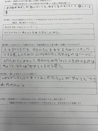 今まで優しさについて考えてなかった。困っている人を助けたり、相談に乗るだけだと思ったけど、優しさにもいろんな意味があるってわかって、この授業をやれてよかった。