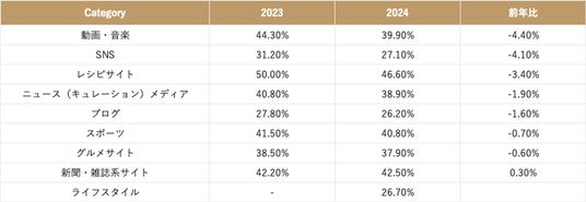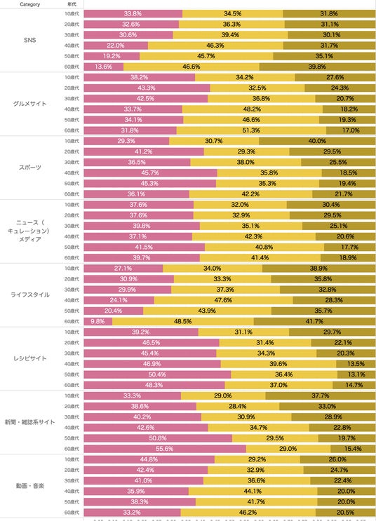 「動画・音楽メディア」「SNS」「ニュース(キュレーション)」「新聞・雑誌系」「レシピサイト」「スポーツ」「グルメサイト」「ライフスタイル」