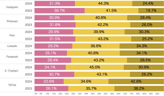 昨年は「Instagram」への信頼性が頭一つ抜けている状態でしたが、各SNSへの信頼性はほぼ横並びの結果となりました。相対的に「X(Twitter)」への信頼度が下がっており、「Facebook」が「X(Twitter)」を上回る結果となりました。