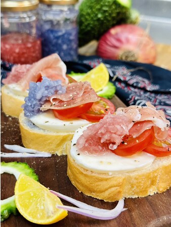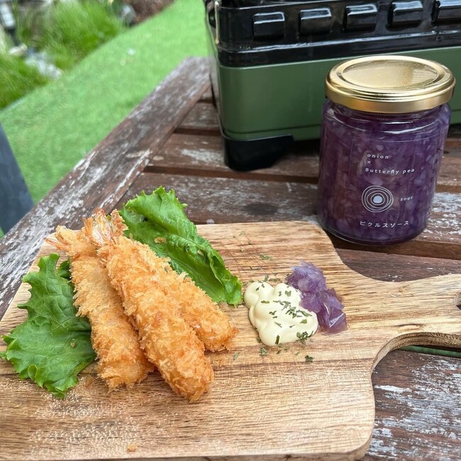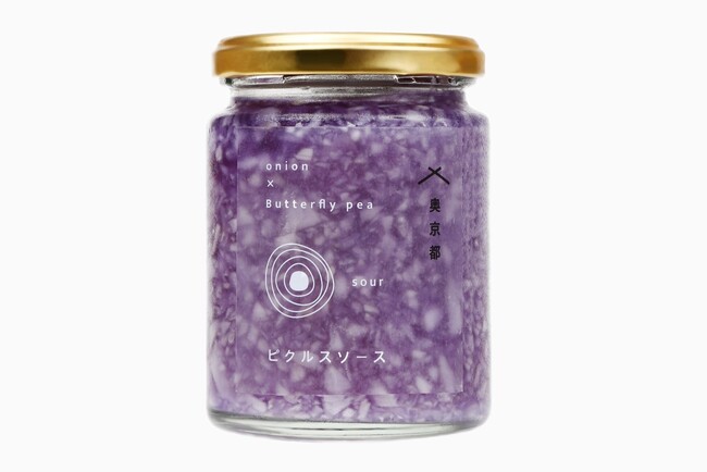 ブルーカラーは天然ハーブ「バタフライピー」を贅沢にたっぷり使用しました。この青い色には「アントシアニン」が含まれ、それは抗酸化作用を持つポリフェノールの一つで、エイジングケア効果を期待できるといわれている天然ハーブです。食欲が失せるといわれる青いカラーですが、このピクルスソースは玉葱とピクルスソースがキラキラと輝きまるで宝石のような見た目。お洒落なお料理に大変身!食欲も失せるどころか増すはず!