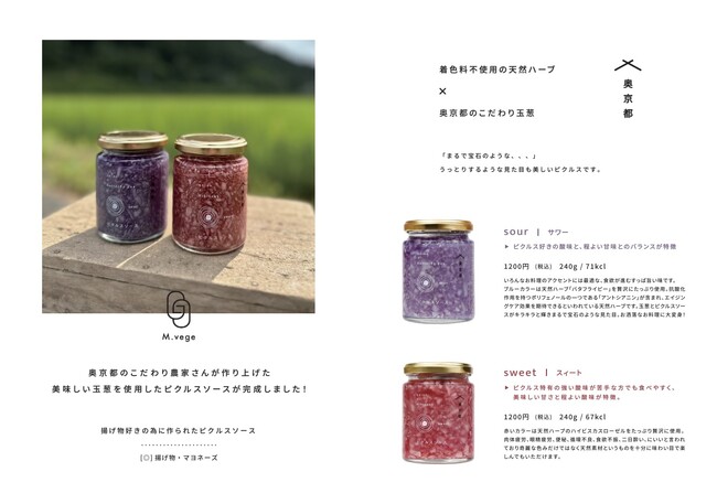食品系バイヤーも注目する「玉葱ピクルスソース」。見た目だけの注目度だけではなく、味も美味しいと評判。この商品が出来上がるまでのストーリーには奥京都の農家さんのこだわりと、農業界のフードロス問題など、農業界を盛り上げたい!どうにかしたい!という思いから出来上がりました。規格外のお野菜は味に問題はないのにサイズの問題だけで買い取ってもらえない、そのお野菜は廃棄処分されている現実。そんな「もったいない!」を解決したい!頑張って作った美味しいお野菜を余すことなく全国の皆様へ素敵な商品にし、お届けいたします!