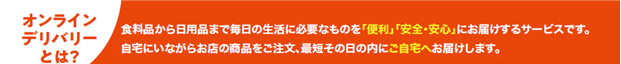 「オンラインデリバリー」は、ショッピングアプリ「Scan&Go」内のサービスで、店舗で取り扱う商品をスマートフォンやパソコンでご注文いただき、ご自宅や配送エリア内のご指定先で最短でその日のうちにお受け取りいただけるネットスーパー機能のほか、EC機能としてシーズンギフトや産地直送品、 ミールキット、家電製品やキッチンツールなど、幅広い品揃えで展開するサービスです。