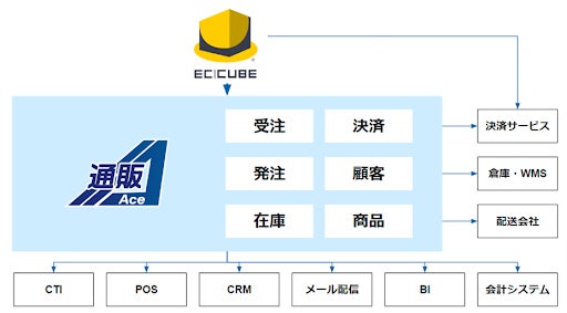 EC事業者は、自社ECやモール、リアル店舗を運営するにあたり、顧客・受注・配送・出荷といった様々な情報データをそれぞれCRMやWMS、Excel、その他業務専門システムなどそれぞれ別システムで保持しているケースが多く、 人材不足やバックヤード業務の効率化の課題を抱えています。こうしたデータ業務の効率化を実現するのが「基幹システム」です。今回、EC・通販専用基幹システム「通販Ace」は導入数やこれまで培ったノウハウなどを株式会社イーシーキューブからご評価いただき、EC事業者のバックヤード業務のDX化を目的に「EC-CUBE」とのプラグイン連携を実現しました。「EC-CUBE」と基幹システムがプラグイン連携するのは今回が初のケースとなります。「通販Ace」と「EC-CUBE」はそれぞれカスタマイズ性が高いことに加え、APIによる疎結合で連携ができるため、お互いのシステムに束縛されることなく自由に機能拡張や構成変更が可能となります。これまでどのサービスでも実現できなかった、より長期的なECの成長に対応できるバックヤード業務DX化、ひいてはEC・通販企業における人材不足問題の解決を実現していただくことができます。「EC-CUBE」や「通販Ace」を活用したDX化の加速を目指すEC事業者にとって画期的な連携となります。