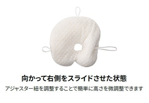 そこで今回開発されたのが『呼吸する赤ちゃんの枕 スライド式』です。ひもをスライドするだけで高さが調節でき、赤ちゃんの向き癖を「自然」に直します。