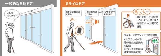 一般的な自動ドアでは当初設定した運転方法を都度変更することはできませんが、「ミライロドア」は自動ドアとスマートフォンの専用アプリをリンクさせ、通行者の属性を把握し、都度開閉速度などの運転方法を変更することができます。加えて、目が不自由な人が近づいたときにスピーカーで誘導のアナウンス等を再生する機能や、車いす使用者には押しにくいタッチスイッチも車いすの方が近づいたときは押さなくてもドアが開く機能も搭載しています。これらの機能は障害のある方の自動ドア通行時の利便性や安全性を飛躍的に高め、施設全体のユーザビリティの向上に貢献します。