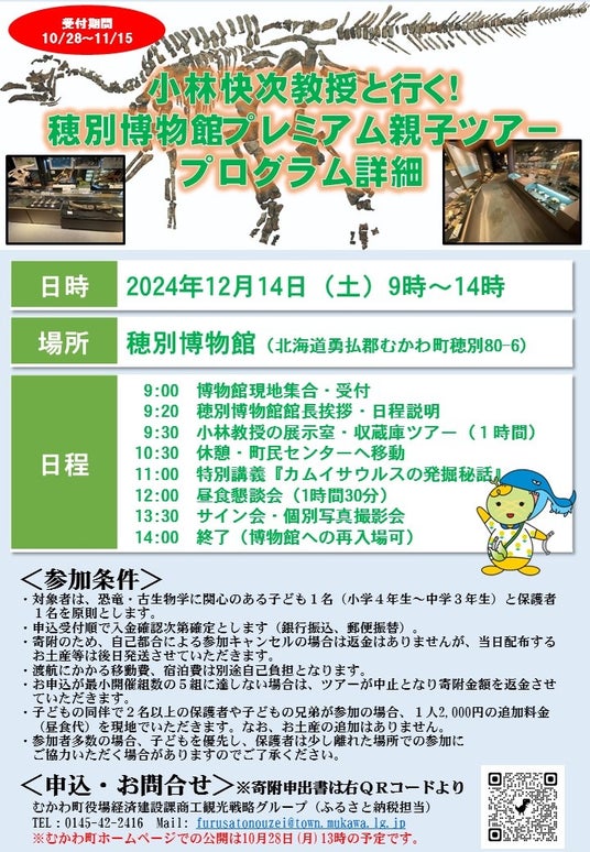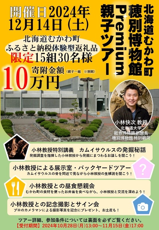 この度、北海道むかわ町ではふるさと納税体験型返礼品として、「小林快次教授(北海道大学総合博物館副館長)と行く!穂別博物館プレミアム親子ツアー」を開催することとなりました。お問合せ、寄附お申込は10月28日(月)から11月15日(金)まで受付けます(定員に達し次第終了)。