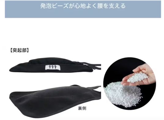 枕部分は、中に「発泡ビーズ(ポリスチレン)」が入っているので、しっとりと体型に馴染む感触。体の重みで発泡ビーズが流動し、自然と自分の腰に合った厚みになります。体重をかけるとビーズが穏やかに動いて身体を優しく支えてくれます。