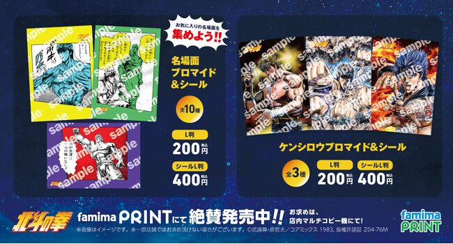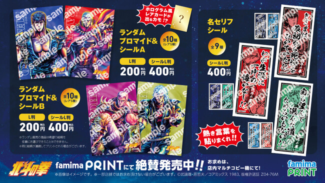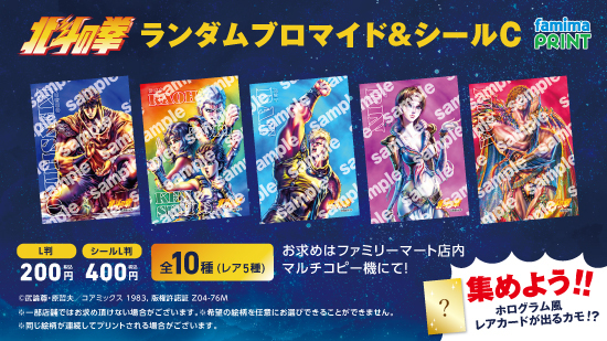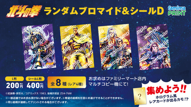 ケンシロウ、幼少期のラオウ・トキ・ケンシロウ、バット、リン、ユダ、黒王号、ファルコ、シャチ・ハン、カイオウ・ヒョウ、計18種デザイン。C・Dの各グループからランダムでプリントされる「ランダムブロマイド」(L判、シールL判)が販売スタート。