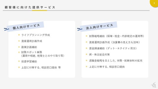 ご加入いただいた場合、まずはヒアリングを基に現在の経営体制や要望を把握し、顧客様への利益相反にならないようアドバイザリーを提供する体制つくり及び講習と並行し、販促・営業及び広報に対する具体的な組織設計から着手いたします。