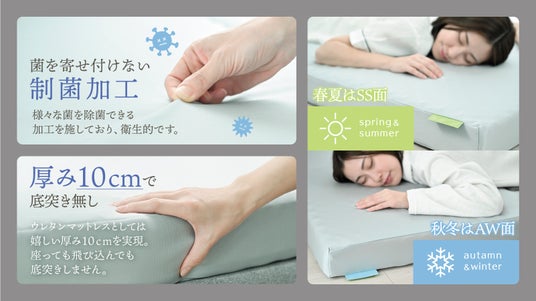 創業64年、ウレタン素材のプロである新英産業株式会社と睡眠のプロである睡眠学博士の白濱龍太郎氏がタッグを組み開発したマットレスは春夏面と秋冬面のあるリバーシブル仕様。