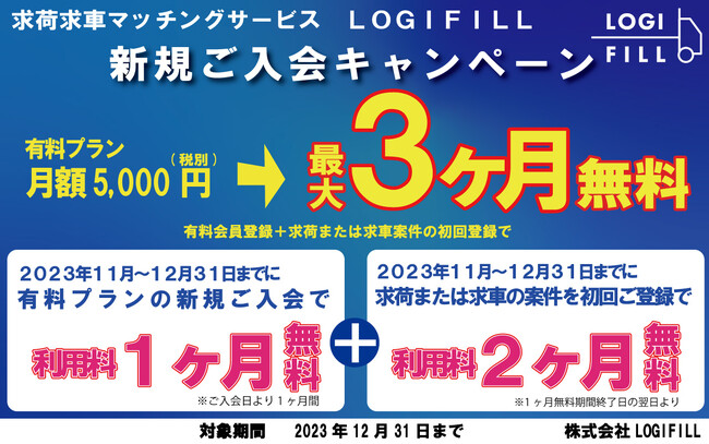 2023年10月にリリースした求荷求車(求貨求車)マッチングサイト「LOGI FILL(ロジフィル)」を営む株式会社LOGIFILL(本社:神奈川県茅ヶ崎市)は、2023年11月14日(火)から2023年12月31日(日)までの期間に、「LOGIFILL」の月額利用料金5,000円(税別)が【最大3ヶ月間無料】となる新規入会キャンペーンを実施いたします。