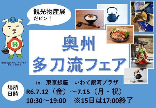 岩手県奥州市は、2024年7月12日(金)から7月15日(月・祝)まで銀座にある岩手県アンテナショップ「いわて銀河プラザ」にて観光物産展「奥州多刀流フェア」を開催いたします。