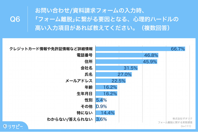 「Q6.お問い合わせ/資料請求フォームの入力時、「フォーム離脱」に繋がる要因となる、心理的ハードルの高い入力項目があれば教えてください。(複数回答)」(n=111)と質問したところ、「クレジットカード情報や免許証情報など詳細情報」が66.7%、「電話番号」が46.8%、「住所」が45.9%という回答となりました。