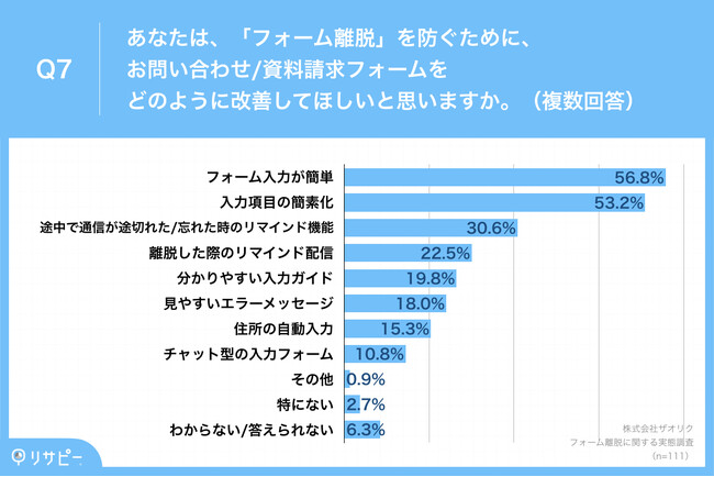 「Q7.あなたは、「フォーム離脱」を防ぐために、お問い合わせ/資料請求フォームをどのように改善してほしいと思いますか。(複数回答)」(n=111)と質問したところ、「フォーム入力が簡単」が56.8%、「入力項目の簡素化」が53.2%、「途中で通信が途切れた/忘れた時のリマインド機能」が30.6%という回答となりました。