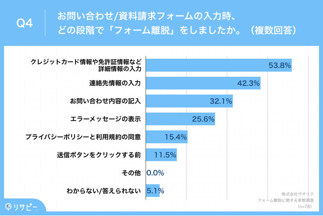 Q1で「はい」と回答した方に、「Q4.お問い合わせ/資料請求フォームの入力時、どの段階で「フォーム離脱」をしましたか。(複数回答)」(n=78)と質問したところ、「クレジットカード情報や免許証情報など詳細情報の入力」が53.8%、「連絡先情報の入力」が42.3%、「お問い合わせ内容の記入」が32.1%という回答となりました。
