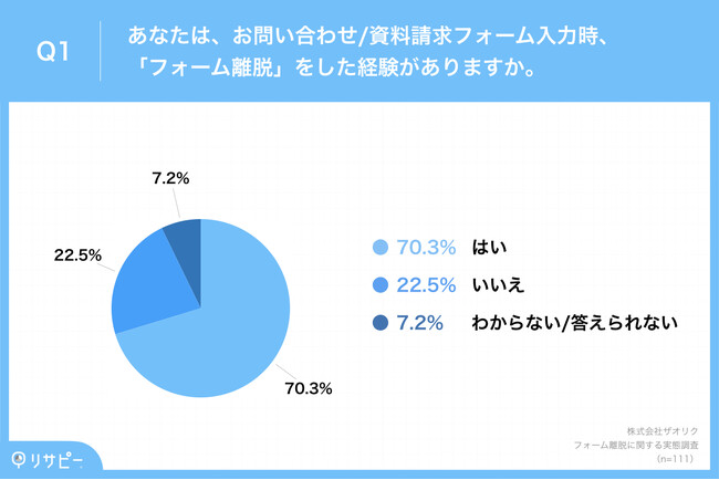 「Q1.あなたは、お問い合わせ/資料請求フォーム入力時、「フォーム離脱」をした経験がありますか。」(n=111)と質問したところ、「はい」が70.3%、「いいえ」が22.5%という回答となりました。