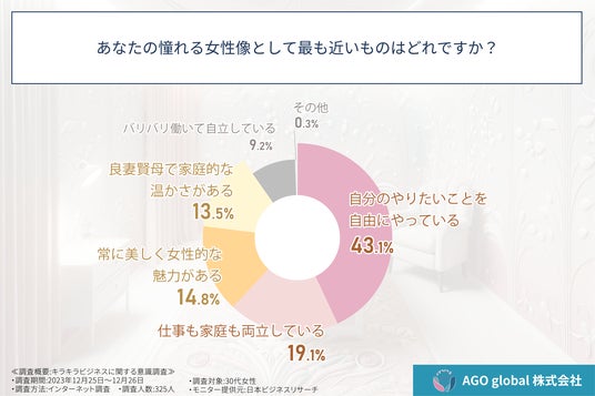 ソーシャルメディアの拡大により、芸能事務所に所属していない一般人でも、キラキラビジネスができるようになり、動画配信やSNS発信を仕事にする女性も増えました。そこで、AGOセラピストスクール(URL:https://agoglobal.co.jp/lp/)は、30代の女性に対し、キラキラビジネスについての印象や今後の動向、自身の理想的な働き方などについて意識調査を実施しました。