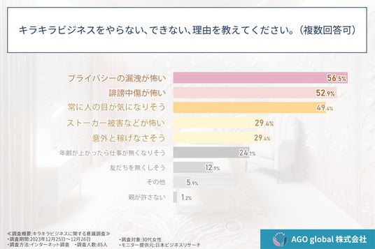 半数以上の票を集めたのが「プライバシーの漏洩が怖い」と「誹謗中傷が怖い」で、これはまさに、実際にキラキラビジネスをしているものの「この仕事が嫌い」と回答した3人の仕事が嫌いな理由と合致します。また、「意外と稼げなさそう(29.41%)」や「年齢が上がったら仕事が無くなりそう(24.71%)」という現実的な意見も多く、キラキラビジネスを仕事として成功させることの難しさを理解している女性が多いことも分かりました。