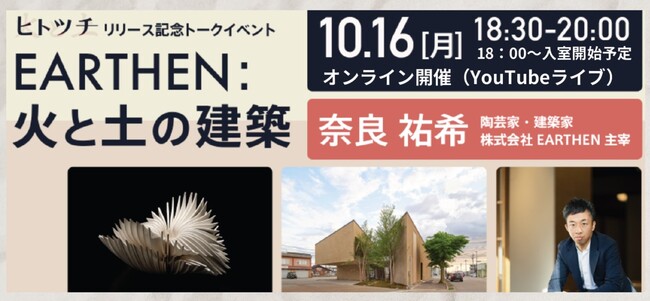 粘土瓦のリーディングカンパニーである株式会社鶴弥が、瓦産業の振興と探求のためのウェブメディア「ヒトツチ」を立ち上げます。そのリリース記念イベントとして、建築家であり陶芸家でもある奈良祐希氏によるトークイベントを、ヒトツチ共同編集長・建築家の黒川彰氏のモデレーションにて開催します。