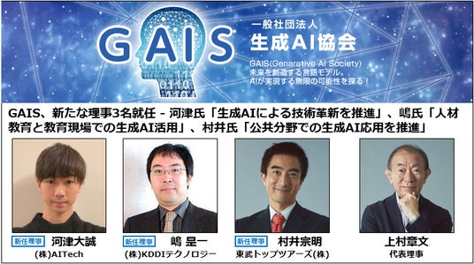 一般社団法人 生成AI協会(代表理事:上村章文、以下GAIS)は、新たに3名の理事が就任したことを発表しました。