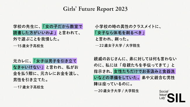 子どもの頃からジェンダー規範(女だから/男だからといった性別による規範)を感じることが多く、それによりガールズたちが自分らしくあることを諦めたり、やる気を削がれたりする傾向にあることがわかりました。