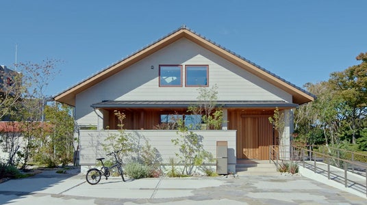 ゆるやかな勾配のある三角屋根とシンプルな外観の家。ダイナミックな吹き抜けとカウンターキッチンがわが家の自慢。そんなひらぎのの家で伸び伸び育ってくれている子供たちの将来の夢は、コックさんと海の生き物の飼育員さん…。