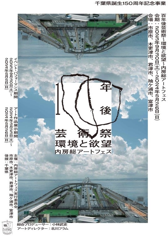 市原市、木更津市、君津市、袖ケ浦市、富津市の内房総5市を舞台に、千葉県誕生 150 周年事業の一環として、「広域連携」「官民協同」による初の試みとして、百年後芸術祭‐内房総アートフェス‐を開催します。アート、クリエイティブ、テクノロジーの力を融合し、百年後の新しい未来を創っていくための持続可能なプラットフォームとしての芸術祭を目指します。