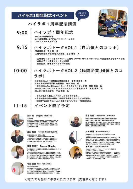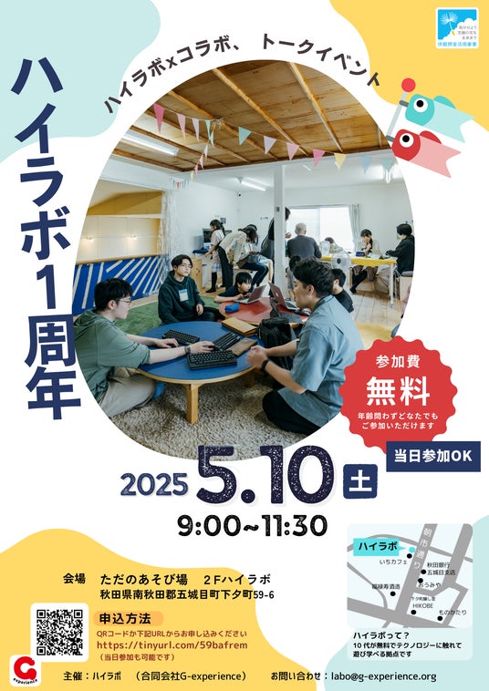 そして、2025年5月17日(土)から秋田高専内アントレプレナー工房アイデア企画空間内にて 10歳~18歳向けのテクノロジー拠点「ハイラボin秋田高専」を設置することを合わせてお知らせいたします。