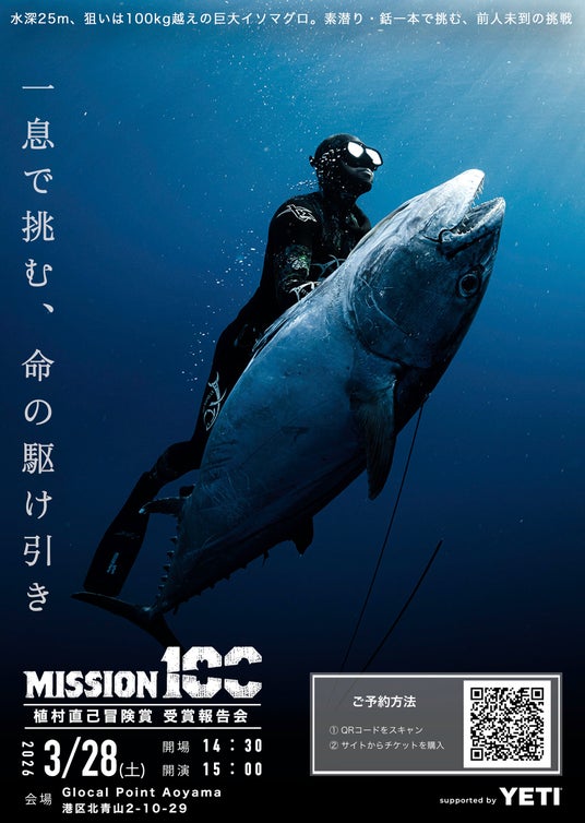 株式会社Mission100(本社:東京都、代表:大崎健太朗)は、プロスピアフィッシャー小坂薫平が「手銛一本、一呼吸で100kgのイソマグロを仕留める」という前人未到の偉業を達成し、2025年度「植村直己冒険賞」を受賞したことを発表いたします。
