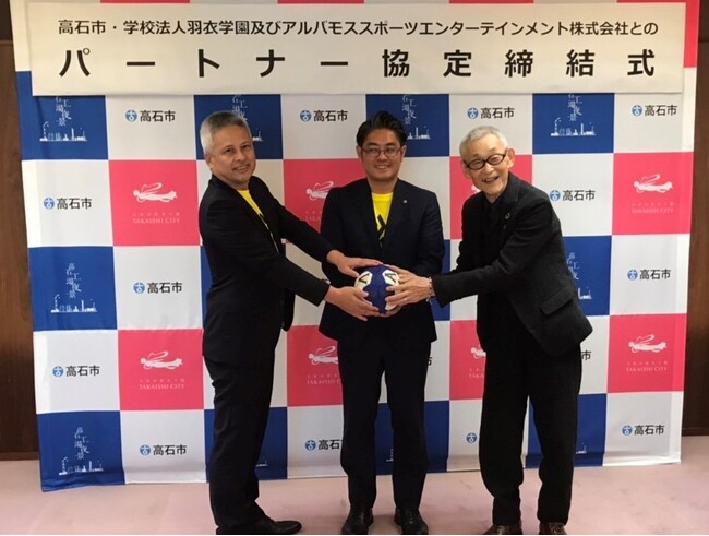 (写真左よりアルバモススポーツエンターテインメント 廣田代表取締役、高石市 畑中市長、羽衣学園 松井理事長)