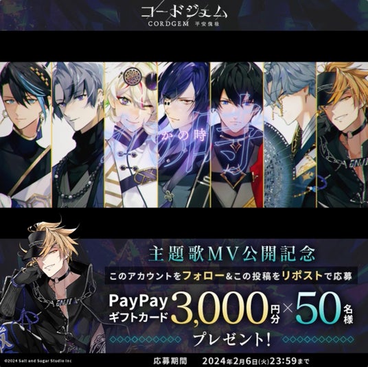 X(旧Twitter)キャンペーン実施中!主題歌公開を記念して、フォロー&リポストキャンペーンを開催します。応募期間内に、コードジェム公式アカウントをフォローし、キャンペーン投稿をリポストすることで、PayPayギフトカード3,000円分が合計50名様に当たるキャンペーンを開催します。