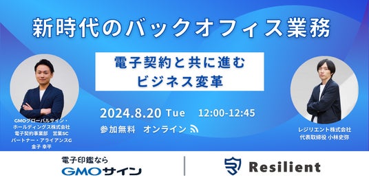 セキュアな電子契約サービスを提供するGMOグローバルサイン・HDと、業務改善を根本から支援するバックオフィス支援サービスを提供するレジリエントが、ペーパーレス化や業務の外部委託のメリットをテーマに、実際の効果を具体的な導入事例を交えてご紹介します。是非、この機会に最新のツールとサービスの情報を入手して、業務改善にお役立てください。