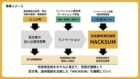 「HACKSUM」は、官民連携のスキームにより行政の財政的負担を最小限に、既存の古くなった公営住宅や移住体験住宅をリノベーションし、宿泊施設としての機能をメインとしながらも季節労働者や地域おこし協力隊、インターン生等を含む短期移住者の滞在住宅としても活用できる「HACKSUM(泊住兼用滞在施設)」として整備することで、空き家の利活用、市街地の宿泊機能強化、住宅不足解消、移住定住促進、関係人口の創出、市街地の活性化などの幅広い地域課題の解決を目指します。