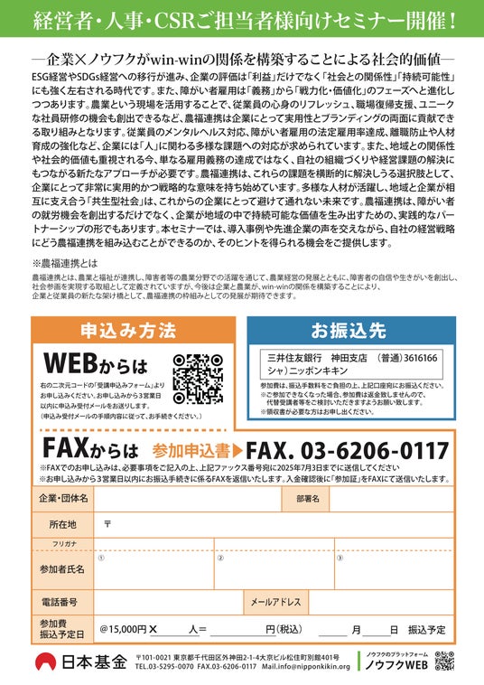 d132180-3-7c1396f87ccf5bb3a86f96f8f5bf691f.pdfESG経営やSDGs経営への移行が進み、企業の評価は「利益」だけでなく「社会との関係性」「持続可能性」にも強く左右される時代に、障がい者雇用は「義務」から「戦力化・差別化」のフェーズへと進化しつつあります。農福連携は、障がい者の就労機会を創出するだけでなく、企業が地域の中で持続可能な価値を生み出すための、実践的なパートナーシップの形でもあります。本セミナーでは、導入事例や先進企業の声を交えながら、自社の経営戦略にどう農福連携を組み込むことができるのか、その実践的なヒントをご紹介します。