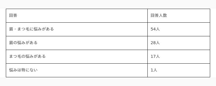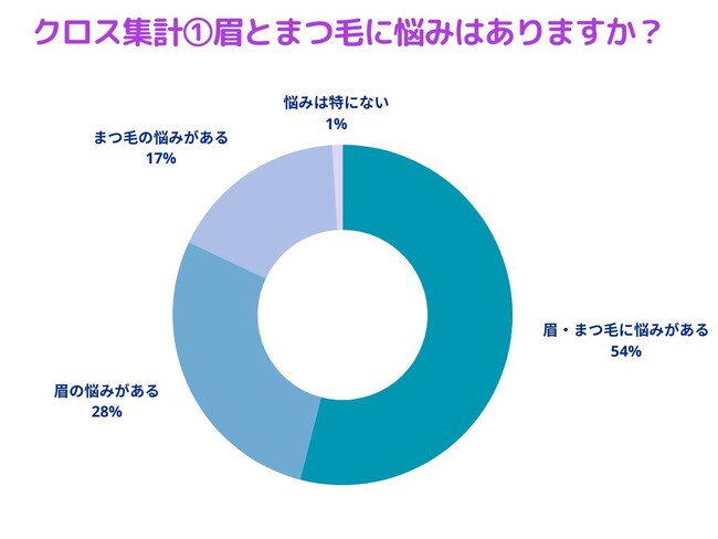 クロス集計として、眉・まつ毛に悩みがあるかお尋ねしたところ「眉・まつ毛に悩みがある(54%)」、「眉の悩みがある(28%)」、「まつ毛の悩みがある(17%)」、「悩みは特にない(1人)」という結果になりました。