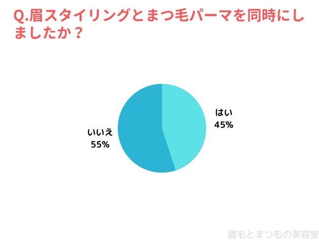 眉毛サロンで、まつ毛パーマを同時に施術した人は「はい(45%)」、「いいえ(55%)」という結果になりました。これは、別々に予約をとった場合も「いいえ」となります。