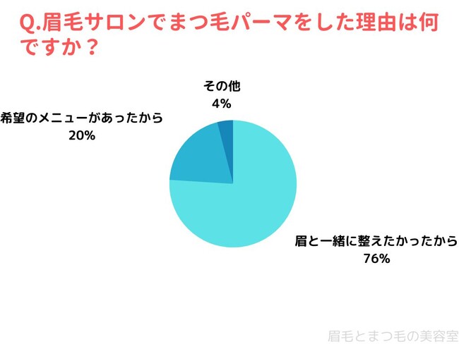 眉毛サロンでまつ毛パーマを施術した人に聞いたところ「眉と一緒に整えたかった(76%)」が第1位になりました。次いで「希望のメニューがあったから(20%)」が理由としてあげられました。