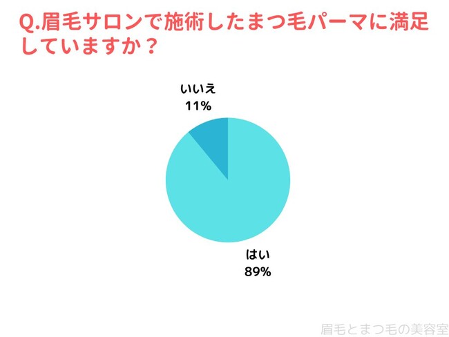 眉毛サロンでまつ毛パーマを施術したときに、その施術に満足しているか聞いたところ「はい(89%)」、「いいえ(11%)」という結果になりました。