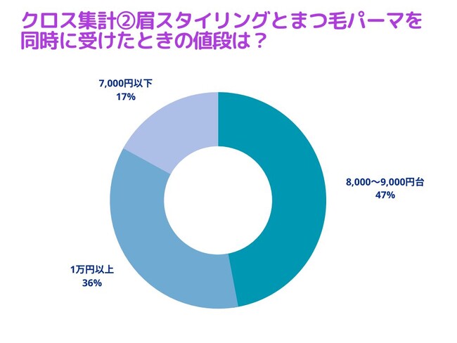 眉スタイリングとまつ毛パーマを同時に受けたときの値段は「8,000~9,000円台(47%)」、「1万円以上(36%)」、「7,000円以下(17人)」という結果になりました。