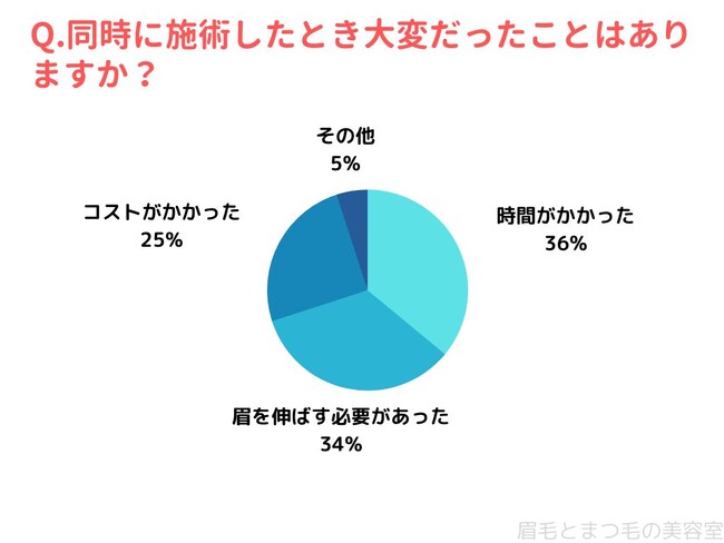 眉毛サロンでまつ毛パーマを同時に施術した人にお聞きしたところ「時間がかかった(36%)」、「眉を伸ばす必要があった(34%)」がほぼ同率となりました。「コストがかかった(25%)」と答えた人も多くいました。