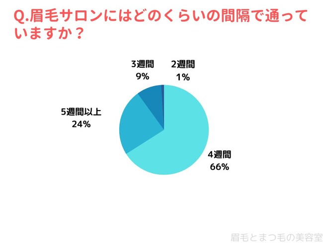 同時に施術した人に、眉毛サロンに通う感覚を聞いたところ「4週間(66%)」が最も多かったです。次いで「5週間(24%)」、「3週間(9%)」、「2週間(1%)」という結果になりました。