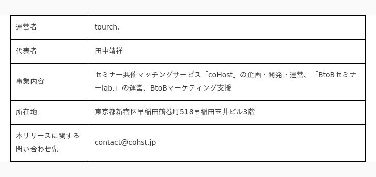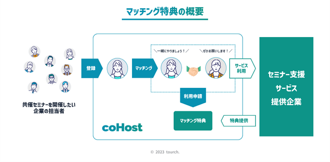 tourch.(所在地:東京都新宿区、代表:田中靖祥)は、最適なセミナー・ウェビナー共催相手を見つけるための、無料で使えるセミナー共催マッチングサービス「coHost(コースト)」(*)において、サービス内でマッチングをしたユーザー向けのお得な「マッチング特典」の提供を開始します。